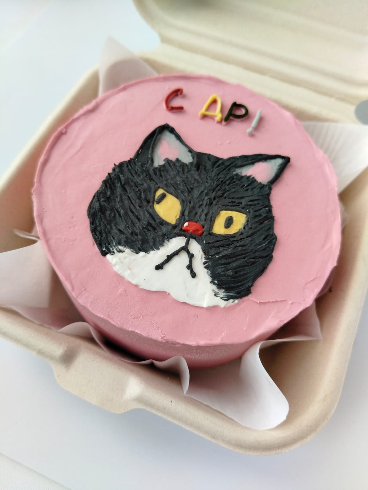 Бенто тортик-котик с надписью "С ДР!", исполненный в шутливой манере, яркими контраснтыми цветами на розовом фоне. Надпись разноцветная. Мордочка котика на торте вы разительно смотрит на позравляемого :)